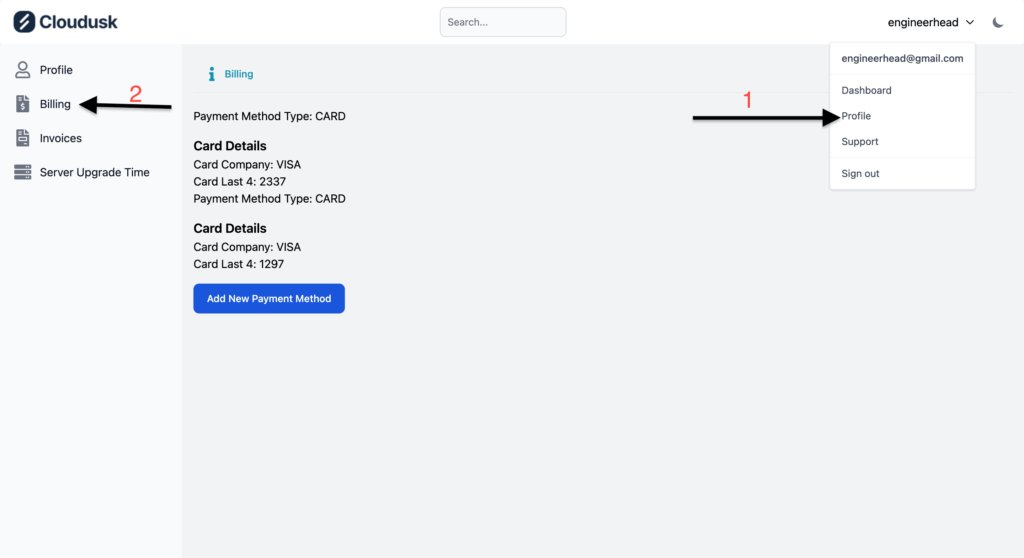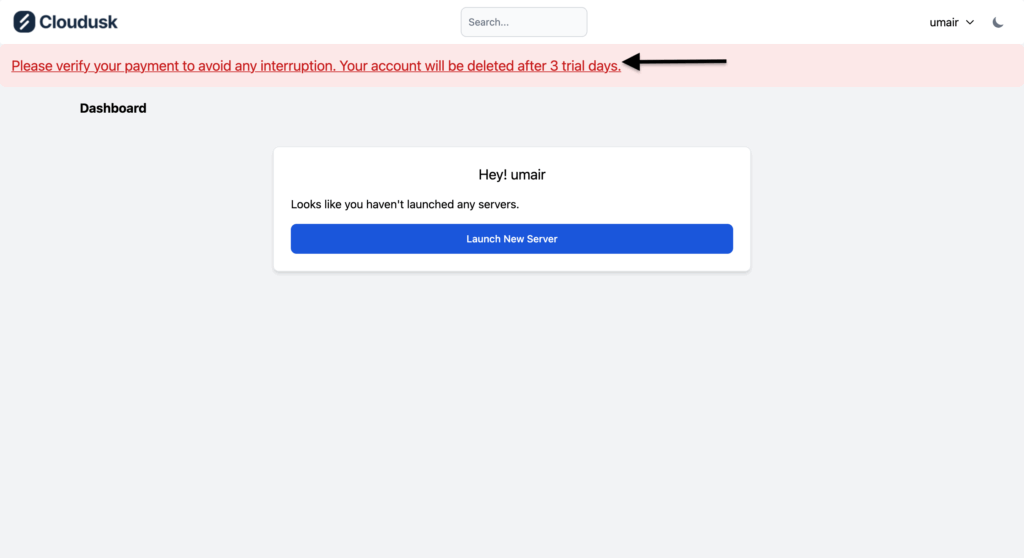 If you have created a new account with Cloudusk and verified it using email and phone, you are automatically subscribed to Trial plan which lasts for 3 days. You can create a server for free and test WordPress websites during the trial period. However, the trial period is only for 3 days, after that your server will be deleted if valid payment/billing details aren’t provided. Here is how to do that. There is a sticky banner at top of dashboard which shows a message to add payment details to avoid any service interruption. You have to click on banner or go the following link