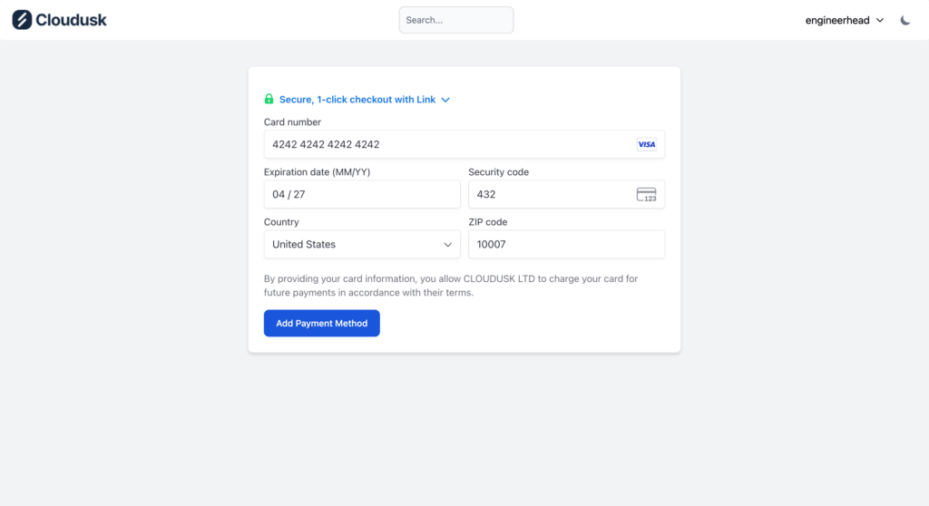 After entering the payment details, press Add payment method button. If the payment details are correct, a toast message will be displayed confirming that payment method was added successfully. After a while, you will be redirected to main dashboard page and the top banner asking for payment details will be gone.