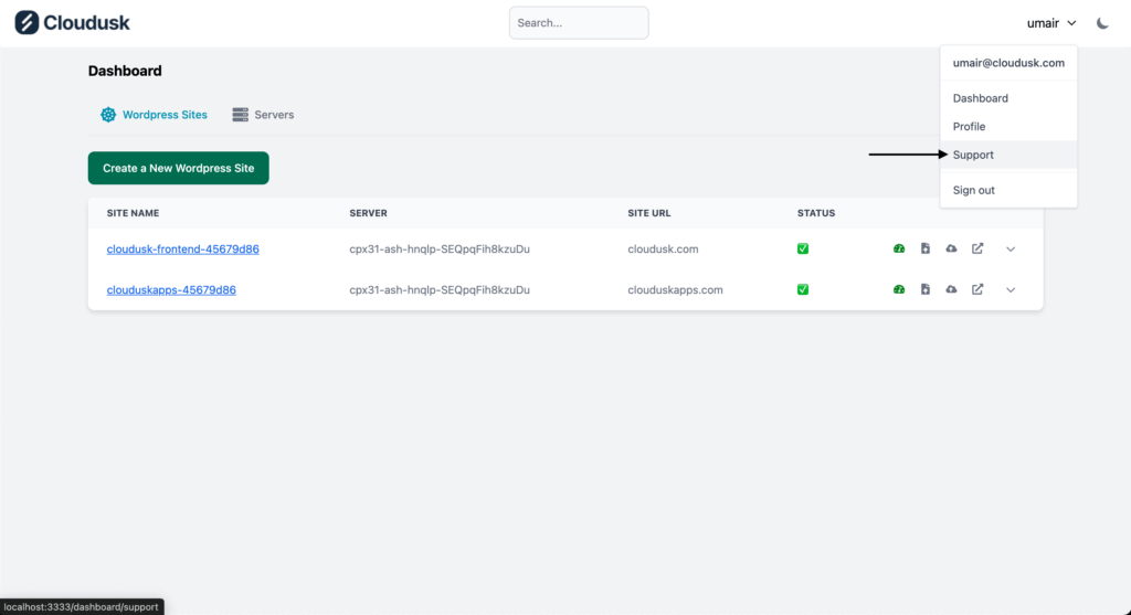 We handle your site with care and provide a preview on a temporary URL before making any DNS changes. Discover just how effortless website migration can be! Start a conversation with us via live chat or open a ticket, and we’ll get to work immediately. Simply provide access to your WordPress site, and we’ll handle the entire process—quickly, securely, and with zero hassle. Live chat is available at Cloudusk’s main site and dashboard as well. To open a support ticket, you have to click on the top right drop down and hit Support.